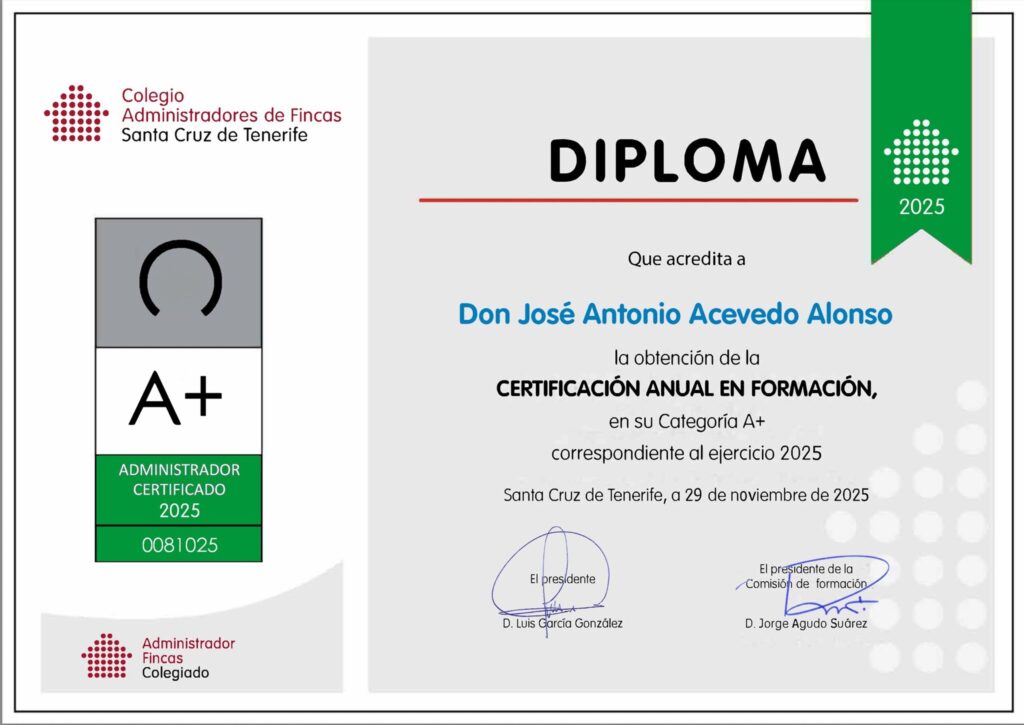 Un año más, 2025, y ya son ocho consecutivos, obtenemos el distintivo A+ de Formación Continua otorgado por el Ilustre Colegio de Administradores de Fincas de Santa Cruz de Tenerife.