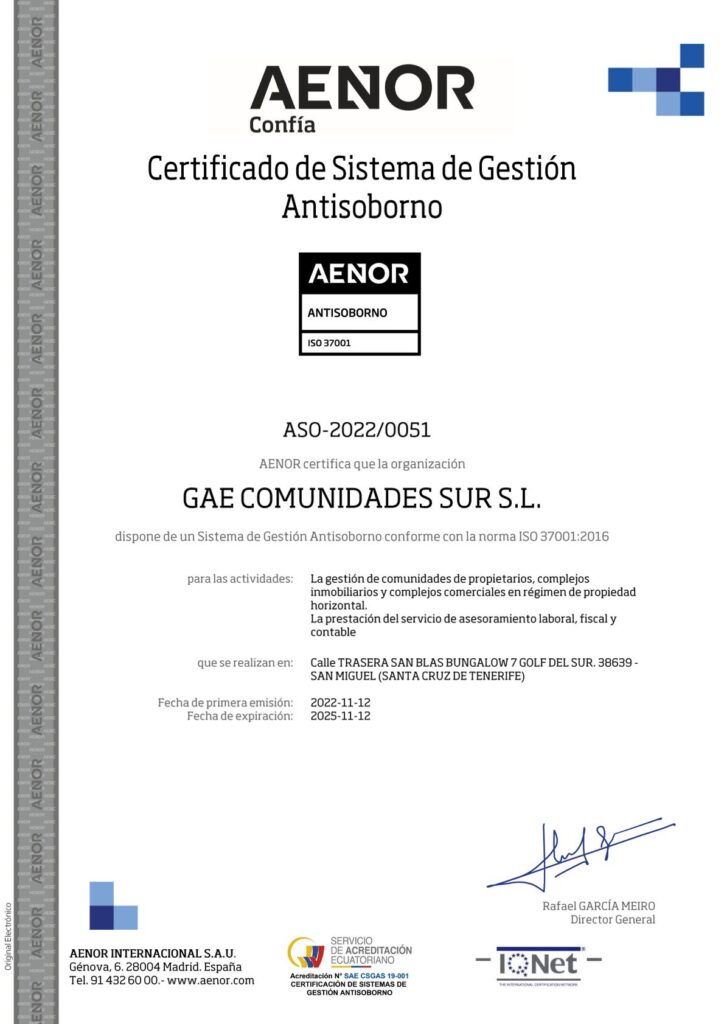 En GAE COMUNIDADES SUR S.L. trabajamos bajo un modelo de gestión basado en la mejora continua, la responsabilidad social y la transparencia. Por ello, hemos implantado y mantenemos activamente diversos sistemas de gestión certificados conforme a normas reconocidas a nivel internacional: